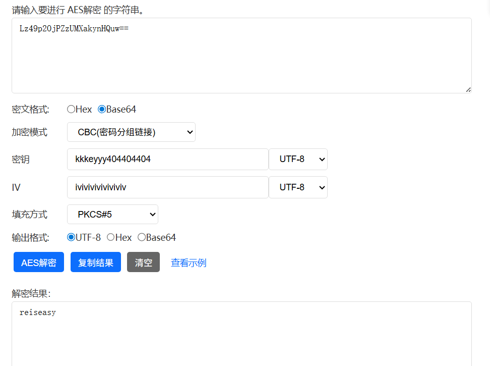 使用AES CBC PKCS5模式进行加密。秘钥是kkkeyyy404404404,向量是iviviviviviviviv。